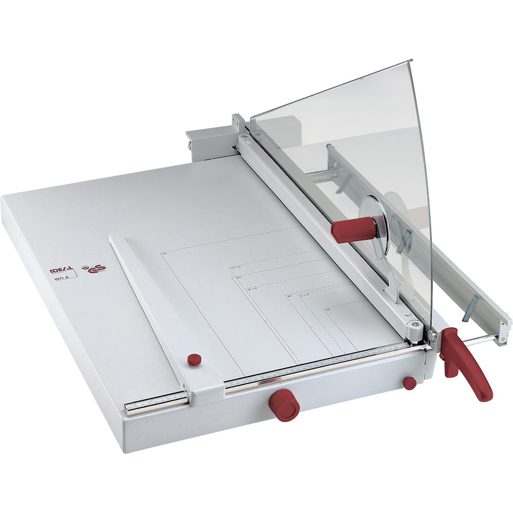 La IDEAL 1071 es una guillotina de palanca profesional de gran capacidad, diseñada para usuarios que trabajan con formatos grandes como DIN A2. Su potente cuchilla de acero Solingen, su sistema de seguridad integral y su diseño industrial hacen de esta herramienta una aliada ideal en imprentas, copisterías y oficinas técnicas.